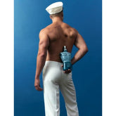 A torso-bottle with assertive masculine attributes. The transparent glass reveals the form of the emblematic garment of the Jean Paul Gaultier man’s wardrobe: the sailor’s shirt, a symbol of freedom and seduction.